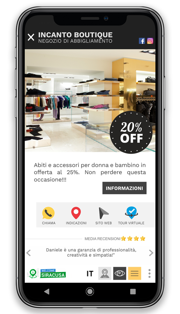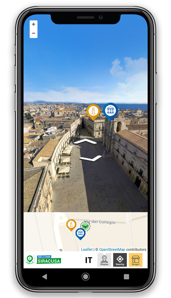 Tutto il meglio delle città italiane in una app. Scarica l’app, scegli la città in cui ti trovi, visualizzala dall’alto e seleziona dove vuoi andare. Avrai a portata di mano una guida turistica completa che ti permette di entrare all’interno di punti di interesse turistico e commerciale.